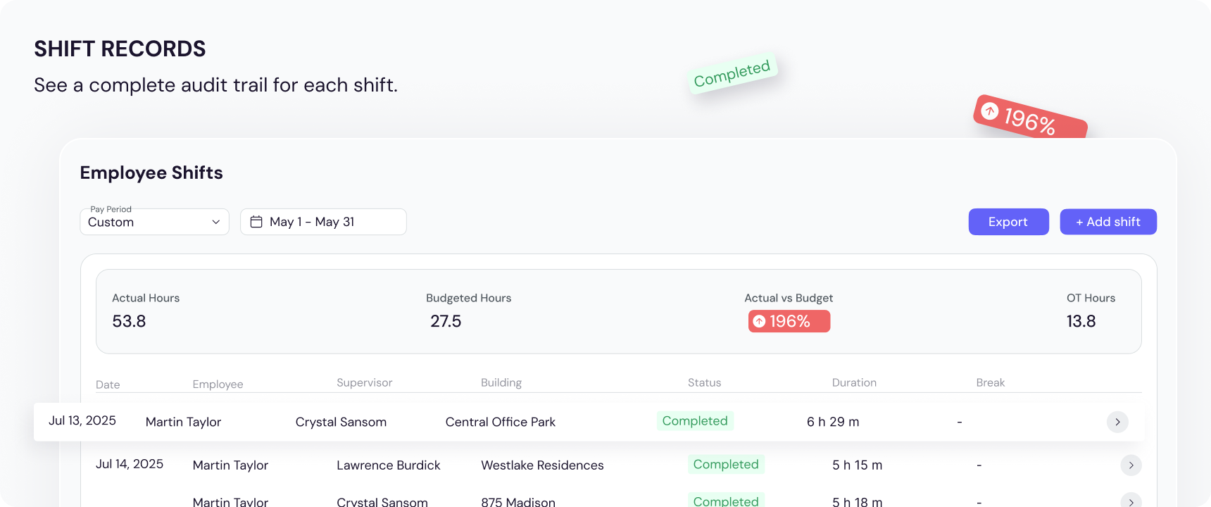 • Shifts are confirmed through reliable janitorial time tracking software.