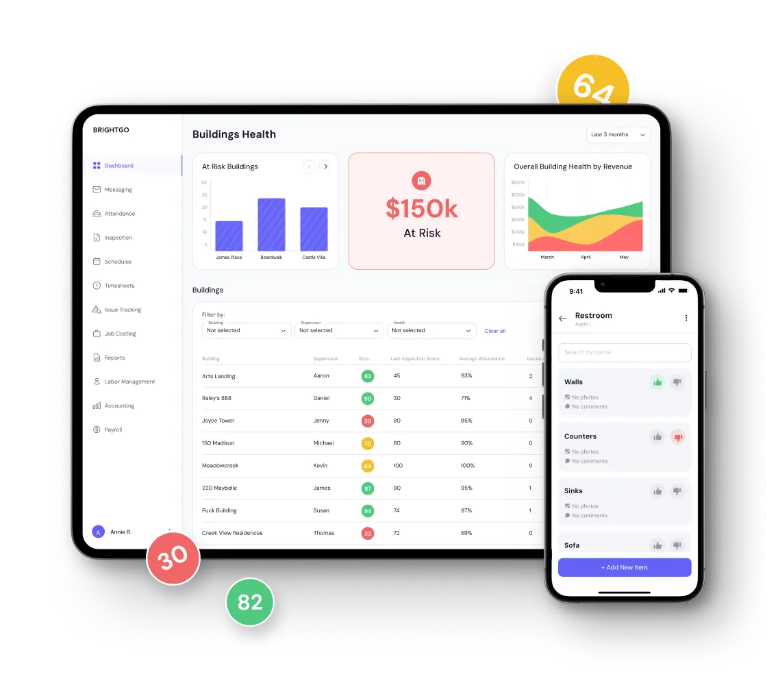 Building health scores show which buildings are running smoothly and which need immediate attention with live data on inspections, attendance, and task completion. Act early, prioritize effectively, and fix problems before contracts are lost.
