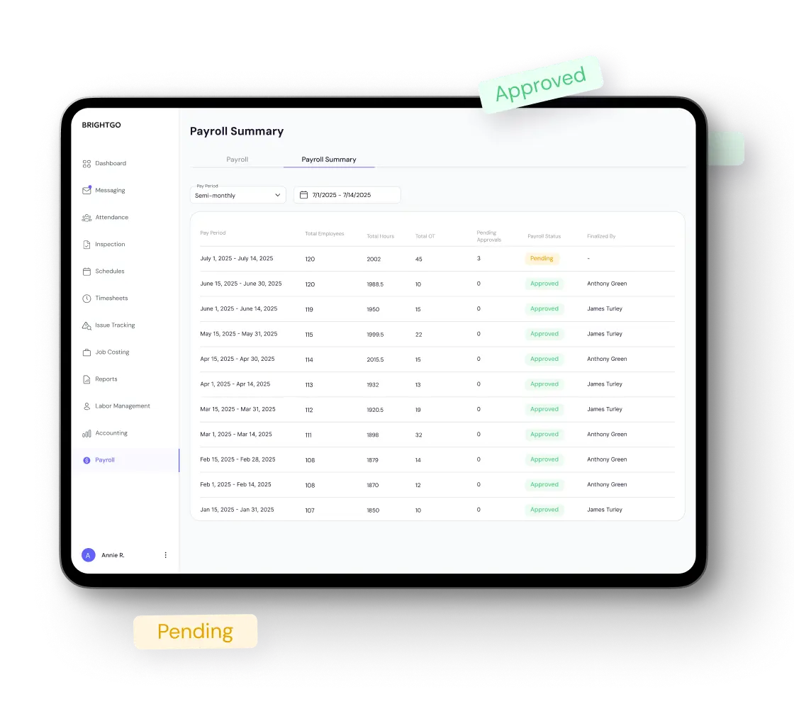 In older payroll systems, even small fixes take too many steps, and compliance often relies on manual checks. With BrightGo, supervisors review missed punches, confirm attestation, and approve timesheets in one place, so payroll runs clean, compliant, and fast to close.